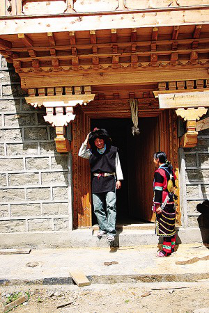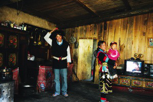 在珞巴族家中,男主外,女主內(nèi),分工相當(dāng)明確。當(dāng)達(dá)瓦在家里和我聊天時,他的妻子群宗一直在忙碌著,忙著給我打酥油茶,忙著生火燒水、煮土豆,忙著照顧孩子。為了讓我能拍一張達(dá)瓦一家人穿珞巴族服裝的照片,大家費了好大勁兒。他們從東家借來帽子,從西家找來褂子,也有從南家借來的飾品……終于,達(dá)瓦和群宗夫妻倆都穿戴上了本民族的服飾,我如愿以償?shù)亟o他們拍了一張全家福。