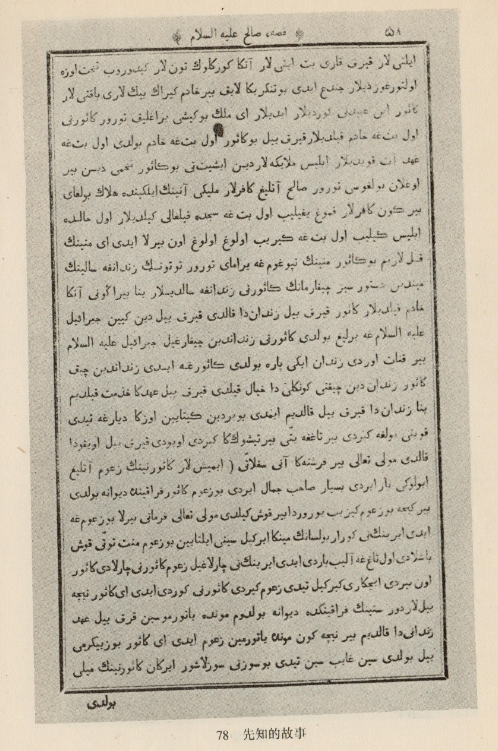 察合臺(tái)文著作。1899年喀山大學(xué)鉛印本。高25.5厘米,寬17.5厘米,共510頁(yè)。作者拉布古孜,寫(xiě)于14世紀(jì)。圖為《先知薩立哈故事》中的一頁(yè)。寫(xiě)的是異教徒們?cè)谀Ч淼闹瓜聦⒁蔀橄戎_立哈的父親卡斯瓦爾關(guān)進(jìn)地牢,天使奉真主之命使他逃出后與妻子見(jiàn)面的故事?,F(xiàn)藏新疆博物館。該書(shū)語(yǔ)言豐富生動(dòng),屬哈喀尼耶語(yǔ)(后期回鶻語(yǔ))和察合臺(tái)語(yǔ)之間的過(guò)渡語(yǔ)言,一定程度上反映了當(dāng)時(shí)的口語(yǔ),是研究維吾爾語(yǔ)言史和文學(xué)史的重要資料。