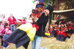 居住在滇西北和滇南等地的彝族也保留著搶婚的習(xí)俗,只是形式稍有不同。在滇西北地區(qū),男方家的人一邊給女方家送彩禮,一邊用氈子強行把姑娘裹走。這時女方家的人可以用假打的方式對付來搶婚的人,并把黑黑的鍋灰抹在搶婚者的臉上。搶婚的人們一個個鍋灰滿面,黑不溜秋的,常逗得賓客開懷大笑。在滇南等地,搶婚的地點、時間都是事先約好的,往往姑娘在田里勞動、在村邊割草或背柴回家的路上就被搶走了。搶到的姑娘直接被領(lǐng)到男方家的堂屋。這也標(biāo)志著雙方正式締結(jié)婚姻關(guān)系了。不管用什么形式搶親,把姑娘搶到新郎家后,都要按當(dāng)?shù)匾妥宓牧?xí)俗,舉行婚禮,并宴請賓客。