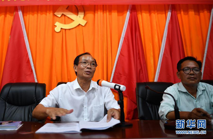 2017年9月28日晚,羊風(fēng)極(左)在海南省白沙黎族自治縣打安鎮(zhèn)田表村村委會組織黨員進行“兩學(xué)一做”學(xué)習(xí)教育活動