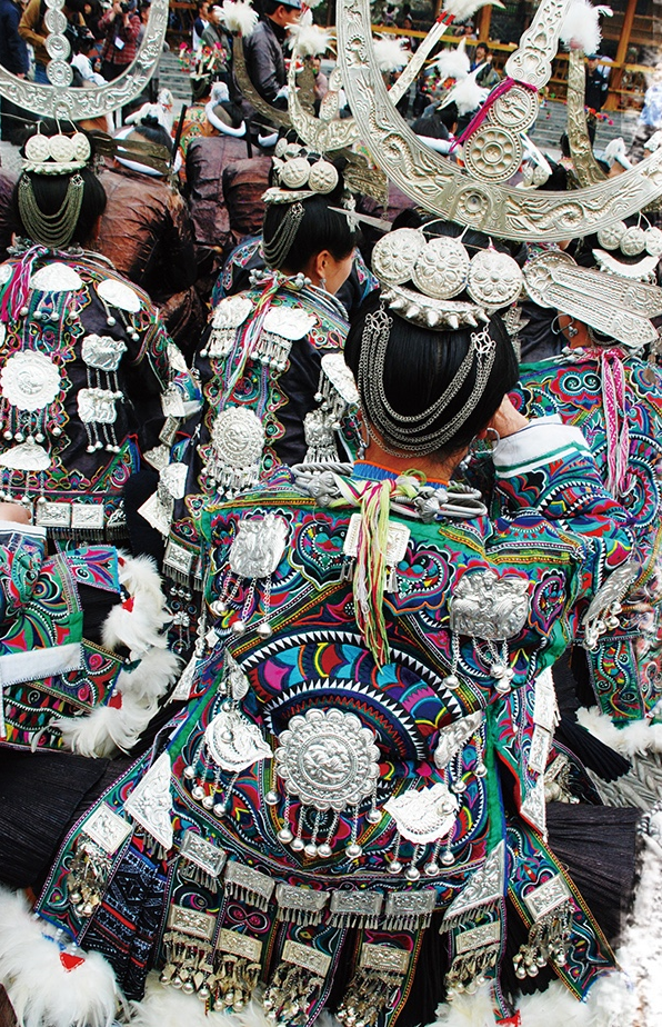 亳無(wú)疑問(wèn),蝴蝶圖騰即是對(duì)蠶的崇拜,蠶文化原初的核心便是人歸途的儀式,人要在這種和蠶一祥的儀式中得到再生。今天的苗族,仍然保持著以絲綢裹身而葬的喪葬習(xí)俗。我祖母養(yǎng)蠶織就的絲織品,我們習(xí)慣稱作蠶絲床單,絕大部分是備著喪葬所用。凡有人去世,主客必送一床蠶絲單,沒有是不行的,被視為不懂禮節(jié),而死者獲得蠶絲單越多越好。有的人家收到的蠶絲單過(guò)多,就會(huì)保存一部分,留著將來(lái)的喪事送禮。苗族每個(gè)人都必備一件絲質(zhì)壽衣。并且,在許多重大的儀式活動(dòng)中必須要著絲綢服裝。比如在苗族重大的鼓藏節(jié)期間,鼓社頭必須穿絲織鼓社服;大祭典活動(dòng)時(shí),祭師也必須穿絲質(zhì)服裝等等。