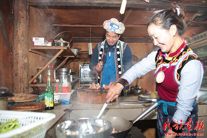 早上,老姆登村73歲的怒族老人斯普早早起來(lái)招呼兒子郁伍林、兒媳魯春花:“春節(jié)快放假了,客棧的生意會(huì)忙得不可開(kāi)交,趁著現(xiàn)在客人不多,家里人先吃一頓團(tuán)圓飯吧?!彼蛊绽习樵缒赀^(guò)世,7個(gè)兒女中老五郁伍林在身邊照顧她。“過(guò)去在春節(jié)才能吃上一頓好飯菜,也要準(zhǔn)備很長(zhǎng)時(shí)間,現(xiàn)在每天都有好吃的,天天在過(guò)年,多虧了黨的好政策。”說(shuō)起今天的幸福生活,生在舊社會(huì)的斯普感慨萬(wàn)千。