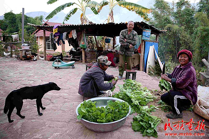 在娜作家記者見到了娜作的老伴兒大巖恩,他邊清理打捆著剛剛采摘下來的青菜邊說:“這些小菜城里人特別愛吃,沒有上化肥,一點(diǎn)污染沒有。這筐菜在城里一定能賣個(gè)好價(jià)錢?!?/p>
