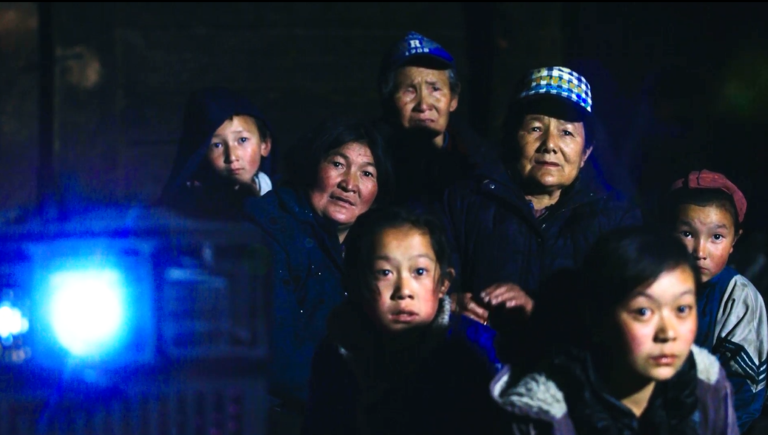 圖片說明:認真看電影的村民