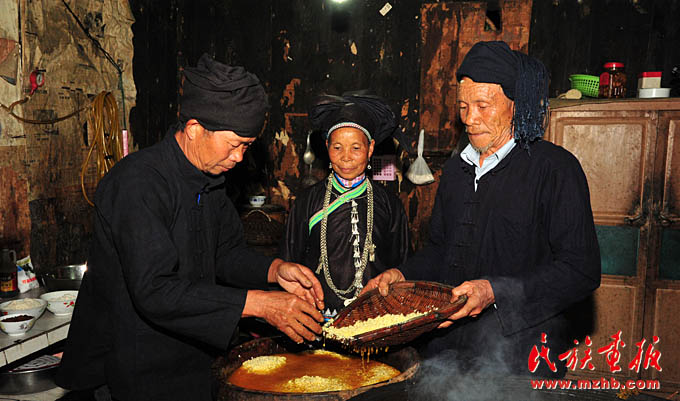男人們蒸制金黃色的糯米飯作祭祀品