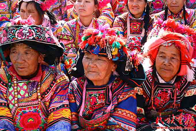 彝族女子不分老少,服裝上都繡滿(mǎn)花卉,鮮艷奪目