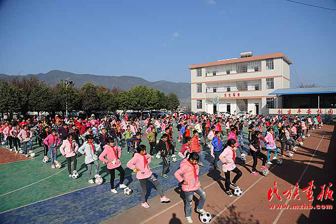 在新村聯(lián)排別墅的最南邊是中村鄉(xiāng)小學(xué),這所學(xué)校是同傈園新村相依而伴建在一起的。上午十點(diǎn),課間操的鈴聲打破了新村的寧?kù)o。學(xué)生們歡快地沖出教室,每人手捧足球,來(lái)到操場(chǎng)。在老師統(tǒng)一的號(hào)令下,孩子們跳起了足球課間操。歡快的音樂旋律,伴著運(yùn)球、帶球等不同的動(dòng)作,孩子們的天真爛漫得到了充分詮釋。小學(xué)校長(zhǎng)張世喜看著學(xué)生們歡樂的表情,高興的表情溢于言表。他說(shuō):“孩子們太幸福了。”16年前,張世喜從楚雄師院畢業(yè)回到了家鄉(xiāng)的中村鄉(xiāng)峨山村委會(huì)小學(xué),“場(chǎng)是土巴地,籃球架是用兩棵大樹做成的,教室里的桌椅高矮不一,找不到品相相同的兩張課桌,孩子們的宿舍是兩三個(gè)人擠一張床……”回憶起那時(shí)情景,張世喜記憶猶新。 “現(xiàn)在好了,住宿生縣財(cái)政每月每人都要補(bǔ)貼100元伙食費(fèi),孩子們頓頓有肉吃了,還為我們建起了兩棟宿舍樓,268名住宿生每人一張床,再也不用擠著睡了。”張世喜說(shuō),在這樣的辦學(xué)條件下,我們工作越來(lái)越有激情了。