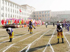 陣擺長(zhǎng)龍跑馬城。“分兵遣將選良才,陣擺長(zhǎng)龍對(duì)面排。正欲齊心奪勝券,格格送信出城來(lái)?!边@首詩(shī)描寫的是滿族兒童春季玩的一種游戲——“跑馬城”。玩這種游戲時(shí),孩子們分成人數(shù)相同的兩隊(duì)橫列,面向而站。玩時(shí),甲隊(duì)先誦兒歌一句,乙隊(duì)接下句,一遞一句:“機(jī)機(jī)靈,跑馬場(chǎng),馬城開,打發(fā)格格送信來(lái)!”“你要誰(shuí)?我要某某某!”被點(diǎn)到名字的兒童立刻向?qū)Ψ經(jīng)_去,對(duì)方陣營(yíng)則手臂相連形成一道防線,沖撞者如果沖破對(duì)方的防線,就從對(duì)方陣營(yíng)中挑選一人帶回自己的隊(duì)伍;如果沒(méi)有沖破對(duì)方的防線,沖撞者就被對(duì)方俘虜了。然后雙方再進(jìn)行下一輪“對(duì)話”和“沖營(yíng)”。游戲結(jié)束時(shí),以剩下人數(shù)多的一方為勝方。這種游戲最適合男孩玩,他們往往玩得滿頭大汗,樂(lè)此不疲!