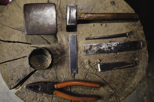 制蘆笙的幾個關鍵技術活——安簧片、點鉛、校音等工序,得由楊枝光親自上。他從工具箱里翻出一只薄薄的銅片,先是湊近看了看,中指輕彈了銅片后把它放到耳朵邊聽,似乎覺得聲音不太悅耳,于是又把銅片放在砧上用鐵錘敲打,再看、再彈、再聽……反復四五遍后,他總算滿意了,這才把銅片粘在笙管底端開口處。裝入簧片,蘆笙才算安裝好。