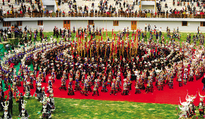 貴州省黔東南苗族侗族自治州雷山縣作為中國苗族歷史上大遷徙的集結地和中國苗族文化中心,以厚重獨特的文化,包括苗年在內(nèi)的11項文化遺產(chǎn)登上了中國非物質文化遺產(chǎn)的殿堂。苗年是苗族一年中最重要的祭祀傳統(tǒng)節(jié)日,是苗家人的一大盛事,每年都有來自全國乃至全世界的游客到雷山參加苗年活動。圖為紅火熱鬧的苗年歡慶場面。