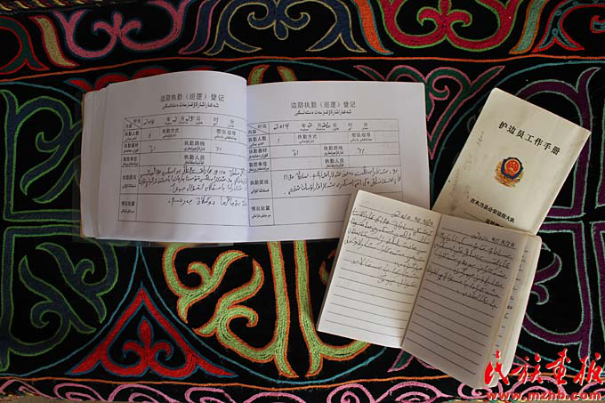 馬合沙提 ·斯拉木每天都要記錄邊防執(zhí)勤(巡邏)情況(趙利 攝影)