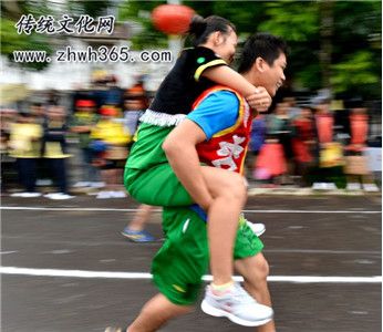 在昌江黎族自治縣一帶流行。每年的農(nóng)歷十五前后,孩子們就聚居在一空曠地,舉行村與村之間比賽。可根據(jù)人數(shù)來分組,每組2人(一男一女),每次由兩組進(jìn)行,實(shí)行淘汰制,男背著女或女背著男亦可,與對(duì)方互相碰撞,男女通過踢、拉、推等動(dòng)作,千方百計(jì)地把對(duì)方背著的人或拉下,或把兩人分開,或倒地。在場觀看的人興高采烈,笑聲不斷,其樂無窮。