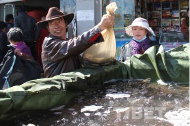 在當?shù)厮幫跎睫r貿市場可以看到,很多信眾或帶著器皿或拿著塑料口袋前往水產店買魚放生。甚至有的信眾開著一輛面包車,車廂用塑料包裹,里面裝滿水,載著買來的一整車魚前往拉薩河放生。 “薩嘎達瓦節(jié)期間,魚賣的特別快,藏歷十五的時候我們的魚都被買光了?!彼a市場的李老板說。