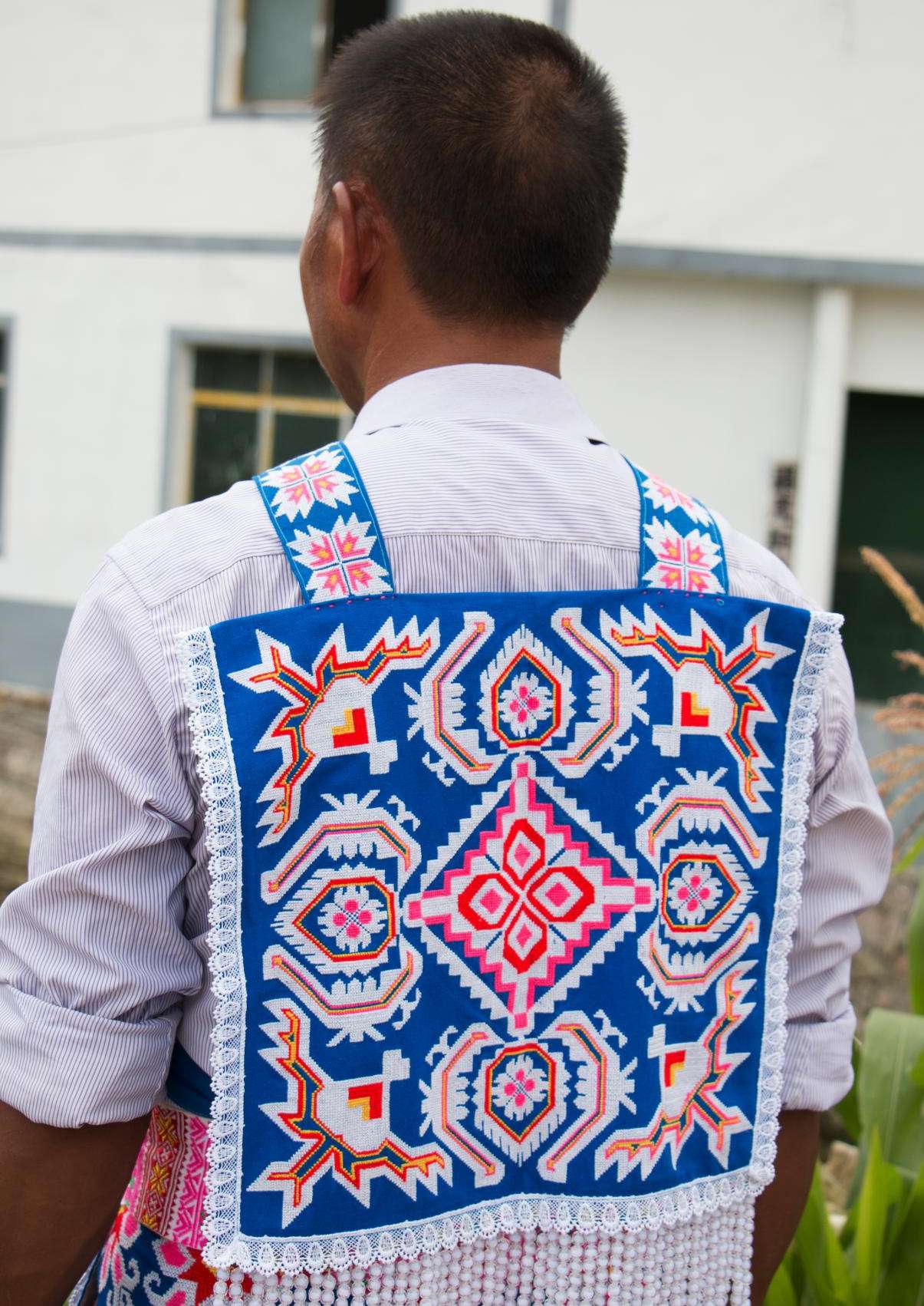 谷立村男子服飾相對(duì)于苗族女子服飾則顯得較為簡(jiǎn)樸,男子上身主要穿著白色打底的對(duì)襟衣,身后背有背牌,背牌底色為藍(lán)色,上繡有花朵圖案作為裝飾。下身主要以藍(lán)色打底的圍裙為主,身前圍裙,上面布滿(mǎn)刺繡圖案。身后的圍裙則為一條條獨(dú)立的絲帶,絲帶上同樣布滿(mǎn)花紋刺繡圖案,在其底部還串有珠簾作為裝飾。