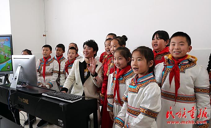 在“快樂的琴鍵”音樂教室捐贈儀式上,朗朗與內(nèi)蒙古藝術劇院直屬烏蘭牧騎演員聯(lián)合表演了《鴻雁》。