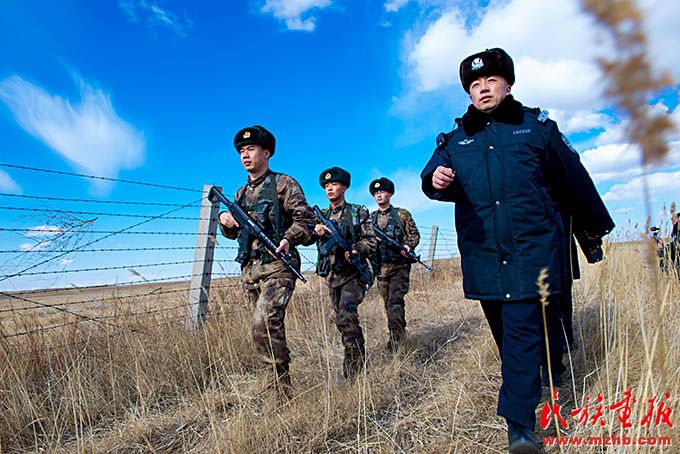 諾門(mén)罕布日德邊防派出所副所長(zhǎng)敖日奇朗(右一)帶領(lǐng)民警與解放軍邊防連隊(duì)聯(lián)合巡邏。