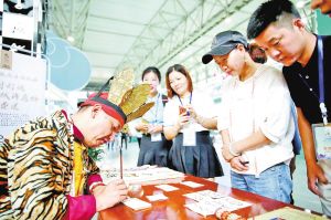 在云南文博會上,來自麗江的納西族東巴文化傳承人現(xiàn)場展示東巴文字的書寫方法。 張彤?dāng)z