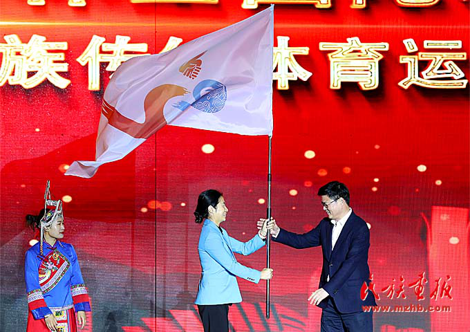 國家民委監(jiān)督檢查司司長隋青向運(yùn)動(dòng)會(huì)授旗。