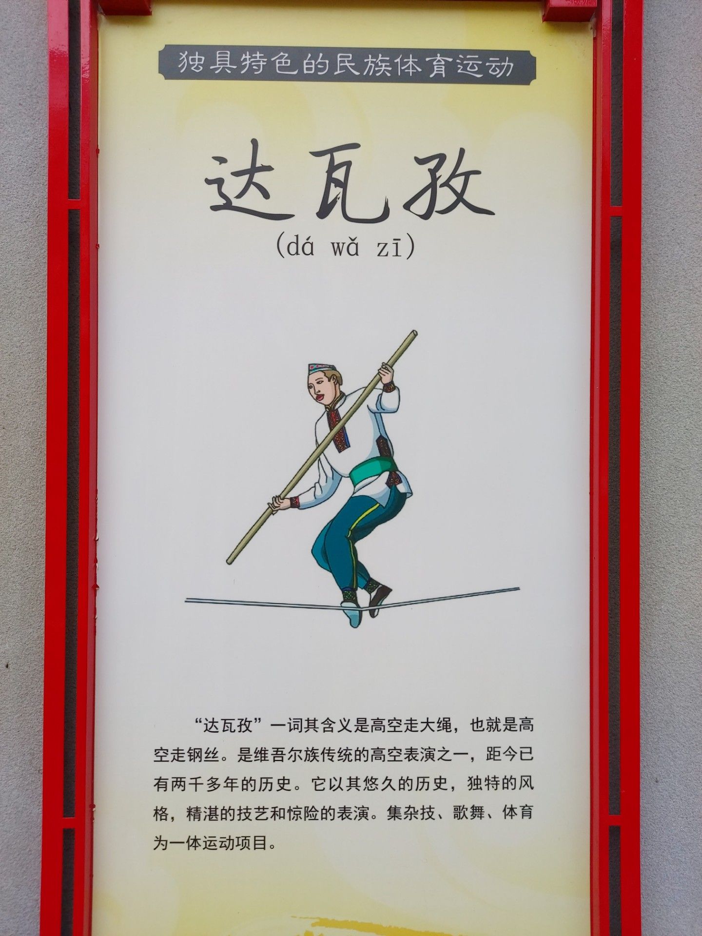 “達(dá)瓦孜”一詞其含義是高空走大繩,也就是高空走鋼絲。是維吾爾族傳統(tǒng)的高空表演之一,距今已有兩千多年的歷史。它以其悠久的歷史,獨(dú)特的風(fēng)格,精湛的技藝和驚險(xiǎn)的表演。集雜技、歌舞、體育為一體運(yùn)動項(xiàng)目。