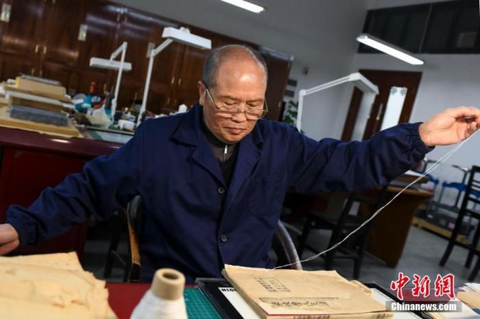 圖為師玉祥將修復(fù)完成的古籍進行穿線訂書。 楊華峰 攝