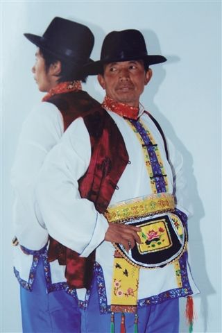 土族的服飾具有獨(dú)特的民族風(fēng)格,青壯年男子,戴有綿鑲邊的氈帽,也有的戴“鷹嘴啄食”的氈帽,身穿小領(lǐng),斜襟、袖口鑲有黑邊胸前鑲一塊四寸方塊的彩色圖案的長(zhǎng)袍,還穿繡花高領(lǐng)的白色短褂,外套黑色或紫紅色的坎肩,腰系繡花長(zhǎng)帶,穿大襠褲,系兩頭繡花的長(zhǎng)褲帶和花圍肚,小腿扎“黑虎下山”(上黑下白)的綁腿帶,穿花云子鞋。老年人一般頭戴黑色的卷邊氈帽,穿小領(lǐng)、斜襟長(zhǎng)袍,外套黑色坎肩,系黑色腰帶,腳穿白襪黑鞋。