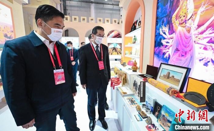 圖為甘肅省副省長(zhǎng)孫雪濤(左)與甘肅省文化和旅游廳廳長(zhǎng)陳衛(wèi)中(右)一同參觀“甘肅館”?!「拭C省文化和旅游廳供圖
