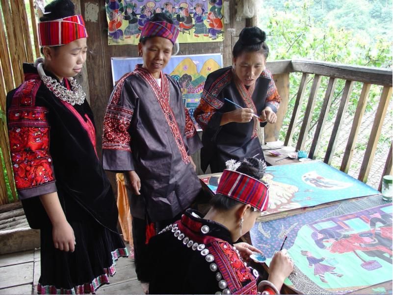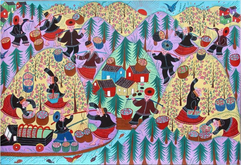 劍河現(xiàn)代民間繪畫源于傳統(tǒng)的苗族刺繡文化,是苗族刺繡文化的另一種表現(xiàn)形式和藝術(shù)升華。傳統(tǒng)的苗族文化多以服飾、歌舞為載體,并以刺繡及演唱等形式進行表現(xiàn)和傳承。早期劍河現(xiàn)代民間畫即脫胎于具有適用性的苗族刺繡樣稿——剪紙和手繪刺繡粉本,換言之,手繪的苗族刺繡粉本便是劍河現(xiàn)代民間繪畫的雛形,劍河第一批優(yōu)秀的現(xiàn)代民間畫作者,即是原當?shù)厥掷L粉本的能工巧匠。劍河現(xiàn)代民間繪畫多以苗族神話傳說中的故事情節(jié)和民俗節(jié)日、生產(chǎn)活動等內(nèi)容為題材入畫,素材涵蓋自然界花鳥蟲魚及人物、家畜等具體形象,造型稚拙天真,設(shè)色濃艷,對比強烈。作品傳達出典型的地域民俗氣息及濃厚的鄉(xiāng)土味,便是其標志性特征。
