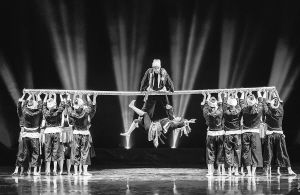 在靜謐的夜空下,首先映入觀眾眼簾的是群舞演員在舞臺(tái)中央,用身體構(gòu)建的人字形“情人房”。房內(nèi)的瑤族姑娘正在小憩,或許是被屋外的動(dòng)靜驚醒,她推門出外察看,重重的門軸聲劃破了夜的寂靜,原來是愛慕者正攀在一根竹竿上向自己示愛。“無竹不成瑤”,舞蹈伊始,最核心的道具——一根長約8米、杯口粗的竹竿就出現(xiàn)了。借助竹竿,群舞演員通過造型組合及隊(duì)形變換,不斷再現(xiàn)生活場(chǎng)景:山坡上、小橋上、屋檐下、窗欞邊……情隨景遷、情景交融,生活圖景和人物情緒巧妙地融合在一起,營造出一種別樣的意境,極大地引發(fā)了觀眾的聯(lián)想。