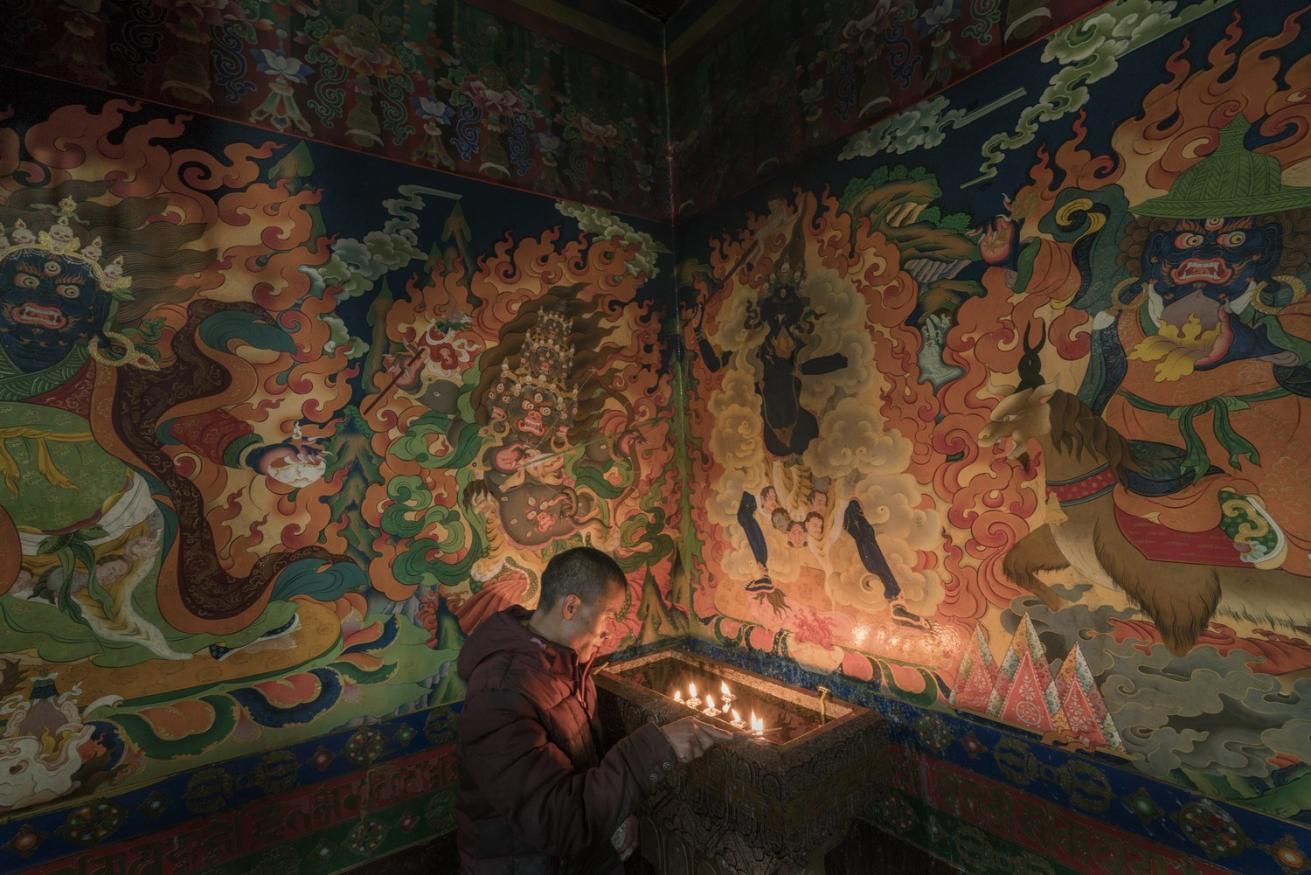 西藏壁畫分布在寺廟、府第、宮殿、民宅、驛站、旅店等地方的墻壁上。而寺院則為壁畫聚集之所,大寺院往往有數(shù)十個到數(shù)百個殿堂,各個殿堂及其周圍走廊的墻壁、天花板等處均繪滿了壁畫,如果把這些壁畫一幅幅地排列起來,那確實(shí)是延綿不斷、絢麗多姿、色彩繽紛的美麗畫廊。