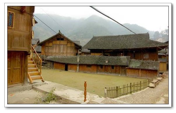 苗族山寨,村民居住的是吊腳樓。苗族大多居住在高寒山區(qū),山高坡陡,平整、開挖地基極不容易,加上天氣陰雨多變,潮濕多霧,磚屋底層地氣很重,不宜作息起居。因而,苗族山寨歷來依山抱水,能工巧匠用本地盛產(chǎn)的杉木,構(gòu)筑一種通風(fēng)性能好的干爽的木樓,叫“吊腳樓”。苗族的吊腳樓建在斜坡上,把地削成一個(gè)“廠”字形的土臺(tái),土臺(tái)下用長木柱支撐,按土臺(tái)高度取其一段裝上穿枋和橫梁,與土臺(tái)平行。吊腳樓低的七、八米,高者十三、四米,占地八、九十個(gè)平方米。屋頂除少數(shù)用杉木皮蓋之外,大多蓋青瓦,平順嚴(yán)密,大方整齊。吊腳樓一般以四排三至五間為一幢,有的除了正房外,外延還搭了一兩個(gè)“偏廈”。每排木柱一般9根,即五柱四瓜。每幢木樓,一般分三層,上層儲(chǔ)谷,中層住人,下層樓腳圍欄成圈,作堆放雜物或關(guān)養(yǎng)牲畜等。住人的一層,旁有木梯與樓上層和下層相接,該層設(shè)有走廊通道,約1米寬。堂屋是迎客間,兩側(cè)各間則隔為二三小間為臥室或廚房。房間寬敞明亮,門窗左右對(duì)稱。有的苗家還在側(cè)間設(shè)有火坑,冬天就在這燒火取暖。中堂前有大門,門是兩扇,兩邊各有一窗。中堂的前檐下,都裝有靠背欄桿,俗稱“美人靠”。大多數(shù)吊腳樓在二樓地基外架上懸空的走廊,作為進(jìn)大門的通道。堂屋外的懸空走廊,安裝有獨(dú)特的s形曲欄靠椅,苗語叫“嘎息”(ghabxil),民間有一美稱叫“美人靠”,這是因?yàn)楣媚飩兂T诖思徏喛棽?、挑花刺繡,向外展示風(fēng)姿而得名。其實(shí)“嘎息”還用作一家人勞累過后休閑小憩、納涼觀景、講述傳承苗族神話和遷徙歷史,以及演唱《苗族古歌》、“嘎百福歌”的多功能涼臺(tái)。外設(shè)長廊、置板凳,便于夏夜乘涼、唱歌、閑聊。中廳設(shè)有火塘,置三腳灶,上部吊禾坑,烘烤谷物或其他食物。火塘兩頭隔開作內(nèi)房,供住宿。