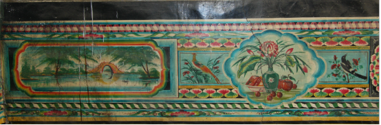 達(dá)拉特旗地區(qū)的墻圍畫高度一般在70厘米左右,其長度則依炕的大小而定。炕上部分的畫是主體,在結(jié)構(gòu)上有一套固定的模式,即以上下兩組邊道,按照一定的規(guī)格布置形成主體框架,中間等距離安排各種畫空,既具完整對稱的裝飾形式美感,又具簡繁對比、主從相映的豐富表現(xiàn)內(nèi)涵。邊道圖案種類繁多,有折子邊、卷帶邊、竹筒邊、花邊等。畫空也稱“池子”,有正方形、長方形、扇形、圓形等多種形式。此外,在下邊道與炕距離25-30厘米的范圍內(nèi)是黃顏色的邊子,這樣的設(shè)計是避免炕上物件的遮擋和抬高人的視線,便于觀賞。