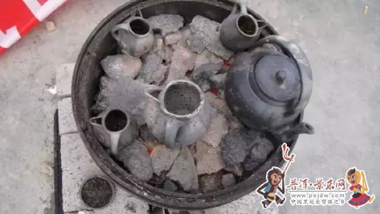 彝家糊米罐罐香茶烤罐要肚大口小,大小適中,茶具為土陶和紫砂制品為主。泡茶取無量山泉水,主要工序是用銅壺將水燒開,先將上好的糯米煎烤至黃,再將取于哀牢無量山的曬青白牙口茶放入抖烤??静钑r(shí)要求“烤關(guān)百抖”,茶葉泛香糯米焦黃,糊米和茶葉烤好后,即沖入少量沸水,讓水自動(dòng)沖除罐口浮沫,放入小片刨開的鮮姜,再加入開水煮一分鐘,即可入杯,奉給客人飲用。