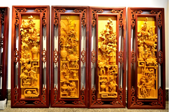 《四條屏掛件》脫胎于“格子門”的上裙板,是由實(shí)用到觀賞的一種很好的轉(zhuǎn)換,是目前最走俏的新產(chǎn)品,無論是賓館客廳或居家,古樸典雅的木雕“四條屏”會(huì)增添不少東方文化的雅趣,越來越受到人們的喜愛,許多人都把它作為木雕藝術(shù)珍品收藏。為了給世人留下藝術(shù)精品,許多工藝師潛心研究設(shè)計(jì)、精心雕刻,用半年、甚至一年多的時(shí)間才完成一件“四條屏”。這些精心之作,疏密有致、變化統(tǒng)一,構(gòu)圖飽滿,穿插纏繞,重重疊疊的層層透雕,無不凝聚著制作者的智慧與心血。《四條屏》的圖案設(shè)計(jì),主要有三種內(nèi)容:(1)博古;(2)花卉;(3)花鳥。人物、山水類型的極少。圖案喻意與格子門相近。