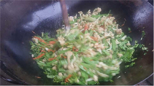 烹制蚵柳,先要挑選好個肥形大的鮮蚵,用心幾遍洗凈,再用篩細(xì)的地瓜粉薄薄拌勻,務(wù)求每只蚵仔獨立成團(tuán),再兜在漏勺里到滾開的水里焯一下即起來,再攤放有竹篩簸里晾干瀝水一個晚上。第二天中午烹制,先把油燒熱,倒入生姜末過油,再依次倒入花菜、荷蘭豆、紅蘿卜絲、芫荽等“菜腳”與鹽、雞粉、料酒、蠔油、胡椒粉、醋等佐料一并翻炒,菜蔬生汁,試嘗咸淡,再倒入已備好的蚵仔團(tuán)翻炒,只需幾下,便已熟透,即可裝盤。