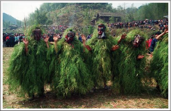 每年十七坡,當(dāng)村村寨寨的蘆笙隊(duì)進(jìn)場(chǎng)了,四面八方的客人都趕來(lái)了,這時(shí),芒篙們就大搖大擺地從山溝溝里走出來(lái),它們?cè)谏侥_上匯合,排列成行,仰望著太陽(yáng),集體叩拜,祈求新年風(fēng)調(diào)雨順;它們經(jīng)過(guò)田園的時(shí)候,整整田坎,看看田水,并齊聲喊“哎——呀”,表示新年豐收在望;它們走進(jìn)每村每寨,所到之處,人們開(kāi)鐵槍、放鞭炮、敲鑼打鼓,歡迎芒篙的到來(lái),以此表示吉祥如意;它們進(jìn)入蘆笙坪,看見(jiàn)小孩,停下來(lái)親切地?fù)崦?,祝福快長(zhǎng)快大;看見(jiàn)老人,親切地?fù)碜o(hù),祝福老人健康長(zhǎng)壽;看見(jiàn)美麗少女,圍著跳舞,以此表示歡迎和祝福。最后,它們沖進(jìn)蘆笙堂,與姑娘、小伙一起跳蘆笙舞,直到蘆笙坡會(huì)結(jié)束,它們才依依不舍地離開(kāi)。