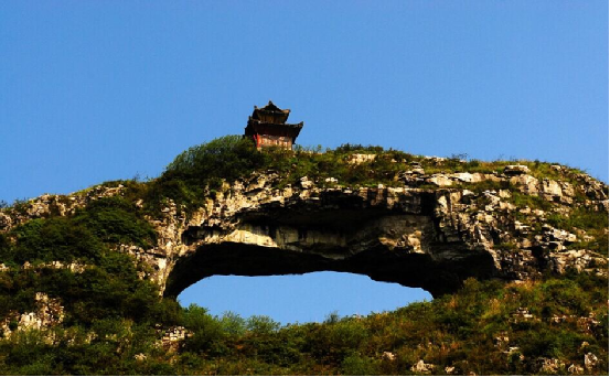 仙橋山位于貴州甕安縣城西南5公里的仙橋村,雄峙于南北伸展的長(zhǎng)嶺之巔。山頂有一長(zhǎng)方形穿洞,遠(yuǎn)望似一面中天明鏡,又若仕女發(fā)髻上的一匹玉簪。民間傳說,那高懸的“橋洞”,是神通廣大的仙人張三豐發(fā)怒時(shí)一拳擊穿的。站在“橋”下仰望“橋”頂,如巨粱橫亙天際,青崖黛壁,輝映云天。天衣無(wú)縫的“橋身”和兩邊的“橋墩”,渾然一體,構(gòu)成跨度約40米,寬20米,高約35米的“橋拱”?!皹蚬啊北泵娴摹皹蚨铡蹦_有形狀各異的石洞,曲徑相通。洞壁有形似人腳印石凹,傳說是仙人張三豐到此云游留下的足跡。