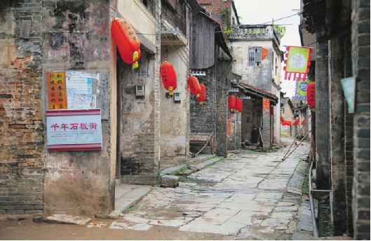 千年老街自北向南,寬約4米、長(zhǎng)約300米,青石板路面。沿街多為典型的嶺南風(fēng)格建筑,二層騎樓,房屋寬敞深長(zhǎng),一樓為鋪,二樓為居,前為店,后為廚。天井頂面多設(shè)明瓦數(shù)塊,以取日光照射,木梯扶手、門(mén)窗雕刻的粗細(xì)花紋無(wú)聲地證明它們?cè)?jīng)的風(fēng)采??吹贸霎?dāng)年舊街果然是繁華過(guò)的,有飯館,有劇院,有酒肆,有客棧,有百貨,街道排水、布局都很合理,有的街道至今在門(mén)前仍有留有水道。