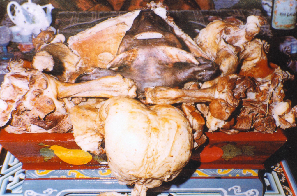 烤全羊、烤羊腿是內(nèi)蒙古地區(qū)特別是阿拉善盟一帶蒙古族人民招待尊貴客人的一種菜肴??救虻淖龇ㄊ菍⒀騼?nèi)臟掏出,煺毛留皮,加各種調(diào)料在特制的爐子里用“扎嘎梭梭”烤制而成,色澤金黃,味道鮮美。