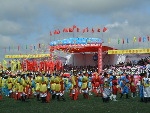 大草原最宜人的時(shí)節(jié)莫過(guò)于七八月。屆時(shí),蒙古族牧民們,就會(huì)穿上盛裝,不管路途多遠(yuǎn),男女老少,舉家乘車(chē)騎馬,云集到綠海如茵的草原上。世界各地的游人也會(huì)紛至沓來(lái),素日寧?kù)o的草原頓時(shí)沸騰起來(lái),藍(lán)天白云之下,彩旗飄揚(yáng),人流涌動(dòng),羊歡馬叫,呈一派繁榮景象。這就是蒙古民族一年一度的草原盛大節(jié)日——那達(dá)慕大會(huì)隆重開(kāi)幕。
