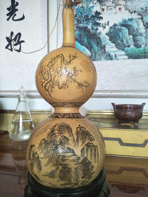 葫蘆雕集繪畫、書法、篆刻藝術(shù)于一體,傳承和發(fā)展了我國傳統(tǒng)“葫蘆文化”。甘肅的雕刻葫蘆最早出產(chǎn)于蘭州,距今約100多年,據(jù)說早期的蘭州雕刻葫蘆比較簡單,對葫蘆不會做刮皮、磨光等加工處理,也不填色;只是在葫蘆表皮雕刻出山水、風景或戲劇人物,作為兒童的玩具,在街頭巷尾出售。到了清代光緒年間,秀才蘭州人李文齋對葫蘆雕刻工藝做了改進。他針對當時雕刻表面粗糙、題材單調(diào)的弊端,首先將葫蘆原生表皮刮去、磨光,并用鏹水混合燃料,染成紅黃二色,是雕刻的景物不易脫落;其次,擴大圖案創(chuàng)作題材,在原有山水、花草等圖案基礎(chǔ)上,增加了如《桃花源記》、《蘭亭集序》、《竹林七賢》等歷史文化和神話故事,形成了圖文并茂的題材格局;最后是在雕刻工具上采用了以針代刀,使圖案形象更加情景交融,栩栩如生。其雕刻葫蘆的特點主要是求其意態(tài)之美,追求神似;人物寥寥數(shù)筆,山水花卉濃淡相宜,形神兼具,求其風雅;題款文字、細如蚊足,點綴成行,瀟灑自如。