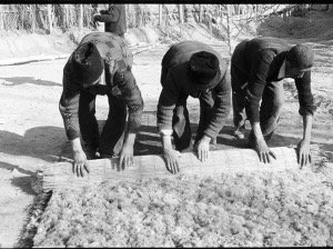 這時,亞生已經(jīng)開始了第二步,他把彈好的羊毛鋪勻,開始噴灑開水。只見他熟練地把水噴向羊毛,然后和妻子一起快速把簾子卷好,用羊毛繩綁緊,再用腳踏著卷好的簾子在平地上來回踏蹬,這樣不停地重復后,做成了氈坯。亞生停下來解開簾子,拉平氈坯,修整好邊角,又灑上熱開水,把氈坯卷起,這是工藝最關(guān)鍵也是最后一步——他們一起跪在簾上,用雙臂反復搓滾氈坯,感覺已經(jīng)平整了,夫婦倆又齊心協(xié)力把氈坯展開拉平,放到院子里。此時,亞生長出了一口氣,抹抹頭上的汗說:“晾干了就可以賣了!”