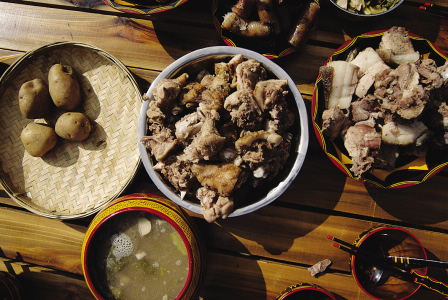坨坨肉是彝歷新年必備的美食。年豬被宰殺后,一般放在竹席上分割,有的被抹上鹽和花椒晾成臘肉,有的則留下來做坨坨肉。坨坨肉因被切成坨狀而得名,大的如拳頭,小的如核桃,在放入涼水的鍋中煮食,僅三沸就撈出。把肉放入容器中,加鹽、木姜子等調(diào)味料,便做成了有名的坨坨肉。