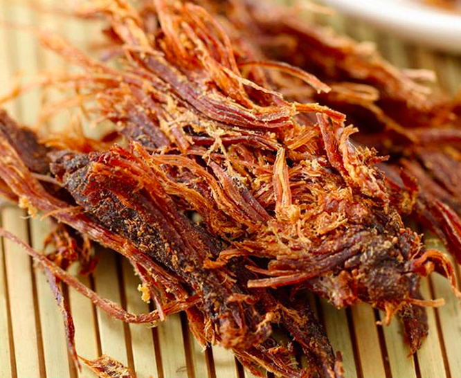 5、捶:將刮干凈的干巴置于砧板,用特制的木捶四周捶,用力要猛,要準(zhǔn),同時(shí)要注意安全,捶數(shù)下,待干巴的呈細(xì)絲狀,取出。