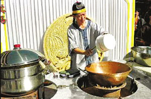 在沈陽(yáng)清文化國(guó)際旅游節(jié)上,廚師現(xiàn)場(chǎng)制作薩其馬