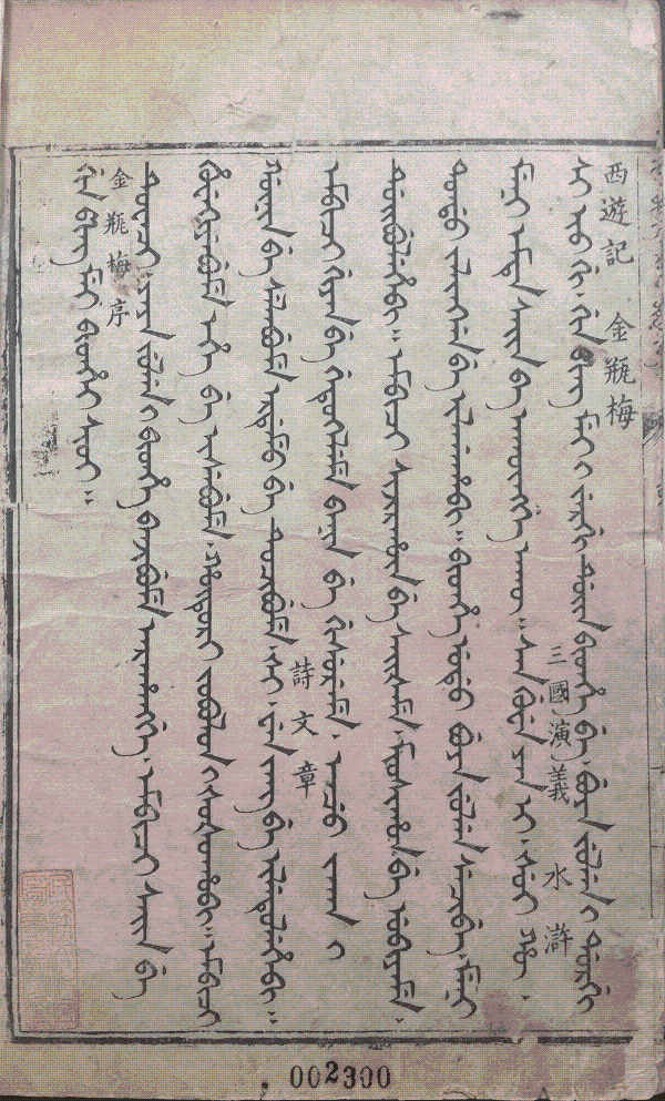 滿文本《金瓶梅》國(guó)內(nèi)藏有國(guó)家圖書館刊本、中央民族大學(xué)圖書館刊本、趙則誠先生藏刊本(殘)、中國(guó)社科院民族研究所刊本(殘)、大連圖書館抄本、吉林大學(xué)圖書館精抄本、中國(guó)民族圖書館刻本等。此外北平闞君云敝處所藏有蒙文《金瓶梅》。