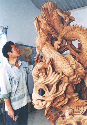 今年54歲的李元生,以雕龍而遠(yuǎn)近聞名。早在上個(gè)世紀(jì)80年代初,他創(chuàng)作的第一件根(木)雕作品《困龍也有上天時(shí)》,便被一位游客購買收藏。在近20年的時(shí)間里,一些常人眼里只能當(dāng)柴燒的樹根,在他獨(dú)特的構(gòu)思和飛舞的刻刀中,變成了上百件大小不一的富有生命力的根(木)雕作品。其中的代表作有:《九龍傳說》、《送子觀音》、《長壽九千年》、《金龍獻(xiàn)寶》、《哪吒鬧?!?、《1999——人與自然》等。這些作品,不少被省內(nèi)外的單位和個(gè)人作為珍品收藏。