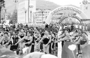 具有濃郁風(fēng)情的重慶酉陽(yáng)土家擺手舞,近年來開始走紅全國(guó)。2002年5月3日,在縣城桃花源廣場(chǎng),舉行了“酉陽(yáng)第二屆土家擺手舞大賽”暨迎接國(guó)家文化部“酉陽(yáng),土家擺手舞之鄉(xiāng)”命名驗(yàn)收。作為“中國(guó)記者酉陽(yáng)行”大型采風(fēng)活動(dòng)成員之一,筆者有幸觀看了土家族上萬男女老少冒雨艷裝重彩、翩躚起舞、歡騰喜慶的場(chǎng)面。
