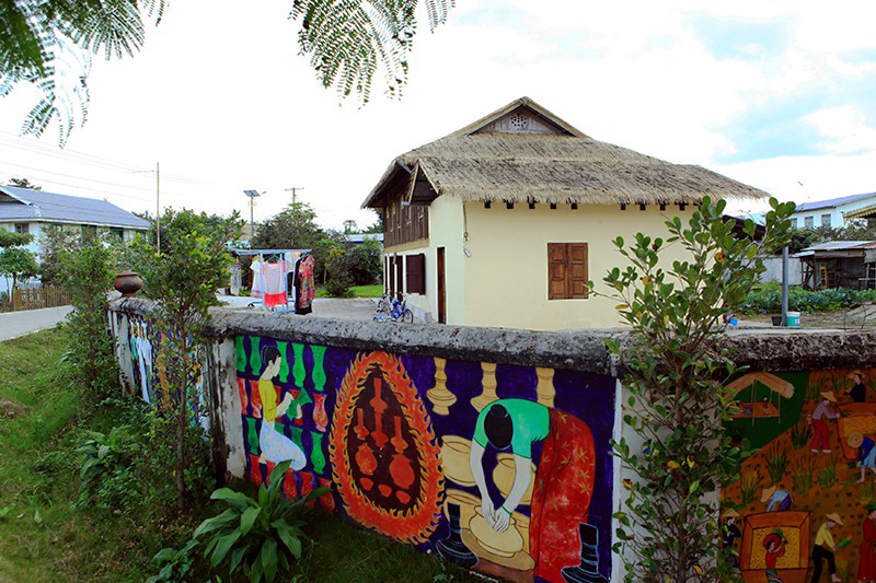 吞也指著家里客廳墻上的畫對(duì)我說:“畫中描繪的是我記憶中的故鄉(xiāng),一些古老的生活環(huán)境和生產(chǎn)方式,我想將這些逝去的生活記錄下來。”墻上掛著的不僅有吞也的畫作,還有一些瑞麗其他農(nóng)民畫師、畫家們的作品。2011年,在文化惠民政策和鄉(xiāng)村旅游開發(fā)的帶動(dòng)下,瑞麗市在喊沙寨設(shè)立了農(nóng)民畫展室,目的是給農(nóng)民畫營(yíng)造一個(gè)原生態(tài)的展示環(huán)境。