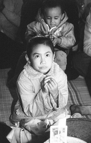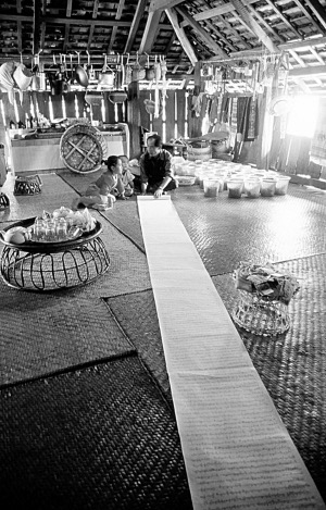 這時,走來一個大佛爺和兩個老人,因為佛祖不會開口說話,他們是來替佛祖給玉波念“薩拉帥”祝詞的。先由大佛爺念了一段《祝福經(jīng)》,給玉波滴了水,然后兩個老人打開玉波那寬半尺、長足有7米多的“薩拉帥”祝詞。玉金說,這祝詞是請曼降村的前大佛爺康朗寫的(康朗:指佛爺還俗的人)。來倆個老人念,是考慮到可以換著念。玉波的奶奶也想到了玉波可能跪不習(xí)慣,就帶來了墊子,讓玉波或跪或坐,因為念完祝詞要兩三個小時。祝詞的內(nèi)容大致是這樣的:“我是一個在菩提樹下長大的女孩,在佛祖的護蔭下,臉長得像菩提樹葉一樣又嫩又青,身材像檳榔樹一樣苗條好看,心像金鹿一樣善良。當(dāng)我年滿12歲以后,人世間的喜樂情愛,貧窮苦難就會來到我的面前。今天在父母的幫助下,我準(zhǔn)備了這些物品來賧給佛祖。我千祈禱萬祈求,希望佛祖保佑我織布是行家,丈夫種田是能手。命里見火能親,遇水能溶。生的孩子女的長得像一只蜜蜂,男的長得像一頭水牛,用他們的勤勞贍養(yǎng)雙親。從小就聽話,自幼就很乖。在母親的懷里不亂哭,在父親的背上不亂搓……”