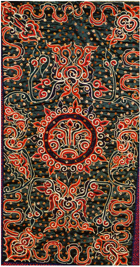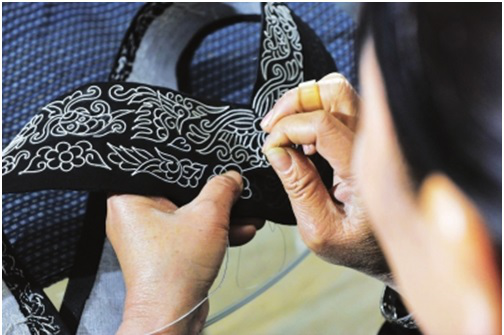 第四步是刺繡,包括三個環(huán)節(jié),即固定框架圖案、填芯和鑲邊。固定框架圖案,即用一根大針將馬尾線穿好,再用另一根稍小的針穿上同色絲線,然后一邊用馬尾線在布面上鑲成各種圖案,一邊用穿有絲線的小針將圖案固定在布面上。填芯,即用各色絲線將固定好的圖案空隙部分填滿。鑲邊,即用橙色和黑綠色絲線在四周挑繡成鑲邊圖案。
